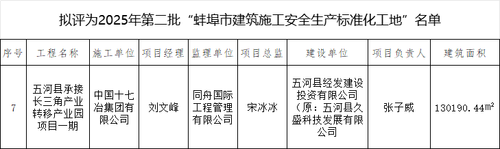 近日,蚌埠市住房和城乡建设局发布《关于拟评为2025年第二批“蚌埠市建筑施工安全生产标准化工地”名单公示》,五投集团投资建设的五河县承接长三角产业转移产业园项目一期成功入选,荣获“蚌埠市建筑施工安全生产标准化工地”称号。