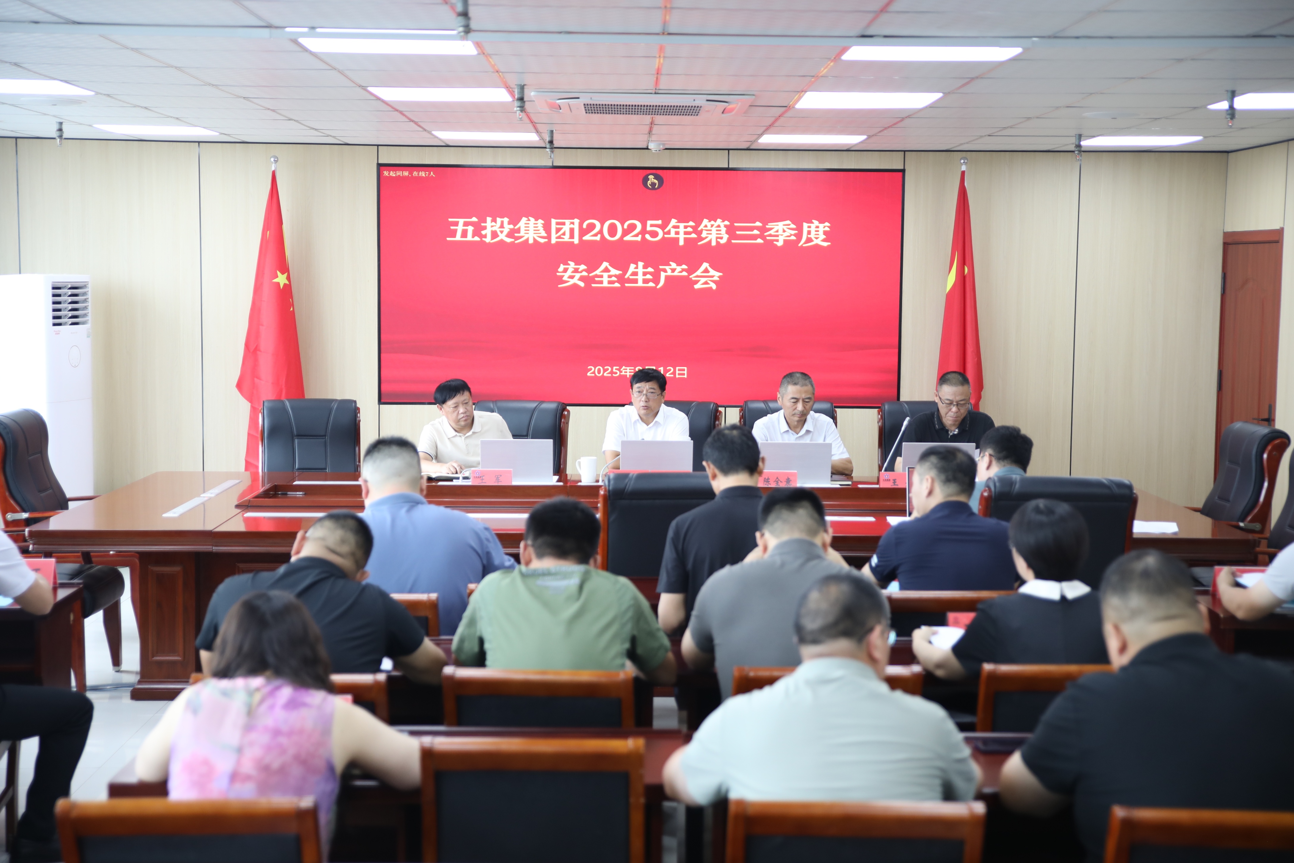 8月12日,五投集团召开第三季度安全生产工作会议,深入学习贯彻习近平总书记关于防汛救灾工作重要指示精神,总结上半年安全生产工作成效,部署下一阶段重点任务。集团领导班子、各职能中心负责人及子公司相关负责人参加会议。