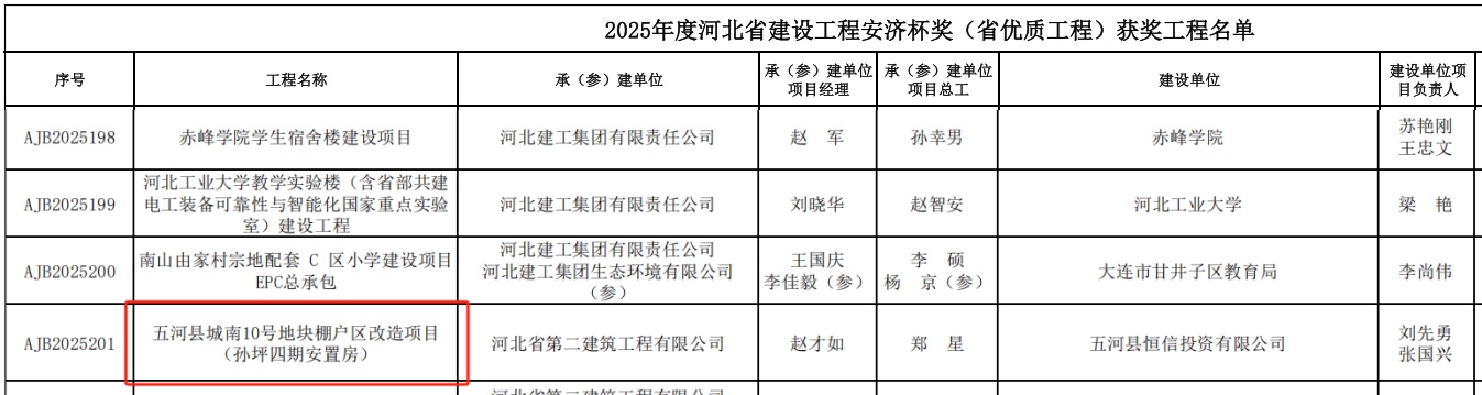 近日,河北省建筑业协会公布2025年度河北省建设工程“安济杯奖”(省优质工程)获奖名单。由五投集团城投公司旗下五河县恒信投资有限公司建设、河北省第二建筑工程有限公司承建的五河县城南10号地块棚户区改造项目(孙坪四期安置房) 荣誉登榜。