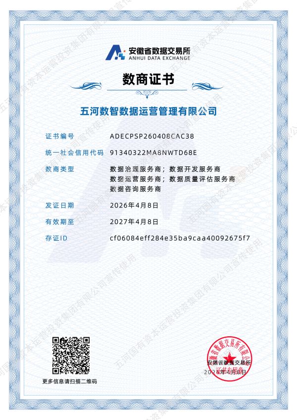 数商证书是企业进入数据要素市场的权威资质认证,被誉为数据市场的“金名片”与“通行证”。此次获批,意味着数智五河公司获得数据要素流通交易的“合法入场券”,可依法合规开展数据产品挂牌、交易撮合、资产确权、价值评估及数据解决方案定制等全链条服务,为政府、企业及行业伙伴提供更专业高效的数据支撑。